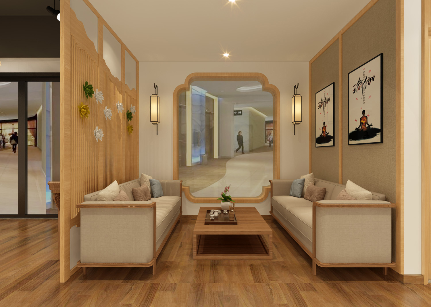 2. 在美容院屏風(fēng)和隔斷之間設(shè)計活動裝飾畫框,通過更換圖片,讓顧客感覺到美容院的新穎,屏風(fēng)和隔斷的設(shè)計要考慮可移動性,如果再配備燈光,個性的化妝品點綴等,這樣會給顧客一種美的享受。